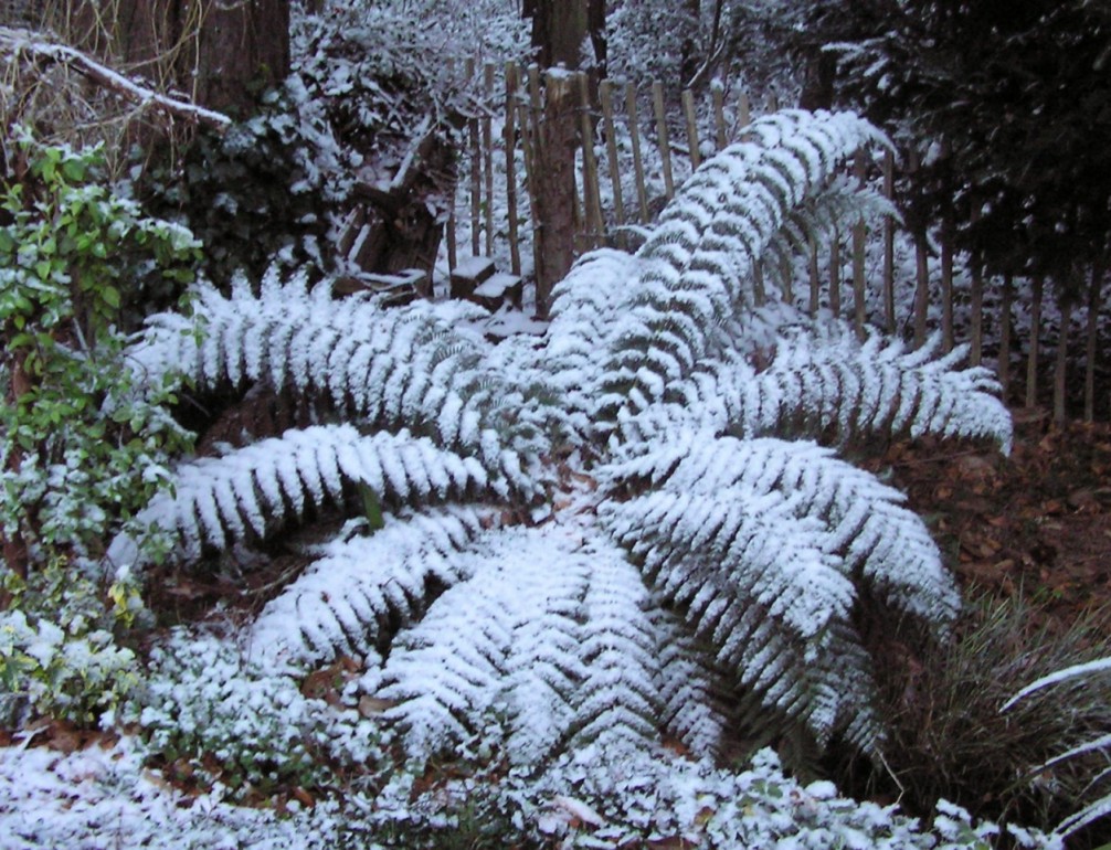 The future, they tell us, offers snow-free winters – so we ought to make the most of every flake we see from now on. On Wednesday last week we woke up to snow – I measured an inch on open ground, and I thought our antipodean fern looked rather pretty. It was enough to encourage Dil to walk to work rather than slide down the hill in the car and, being a gentleman, of course I walked with her. It was interesting to see how many footprints had already been down the paths through the wood – and we thought we'd been early risers for once. As I say, it was only an inch, but it was enough to stop the dustmen (they're not called that any more, are they?) from coming round. Must have been the wrong sort of snow. Next day it had gone. That's it – could be the last snow we'll ever see. Keep the photos. |