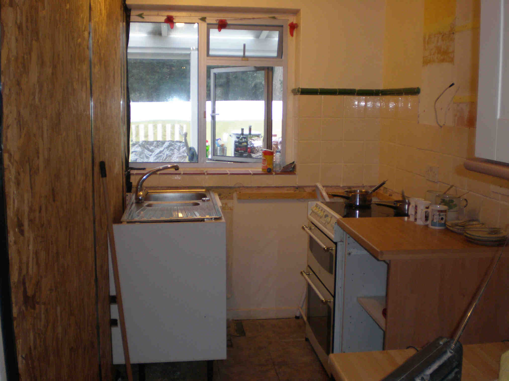 I say 'outside the back door,' but one thing that did happen last week was removal of same and the erection of a stud wall down the middle of the kitchen (see pics on right) to shield us from this week's work – the demolition of the outside wall. As you see, we still have a sink and a cooker in 'our' bit, for the moment. In fact, they are arriving to start demolition work as I speak, so I think I'd better save this in case of power cuts – I know that the wall to be removed (on the left in the left picture) contains some electric cables. Wish us luck! |