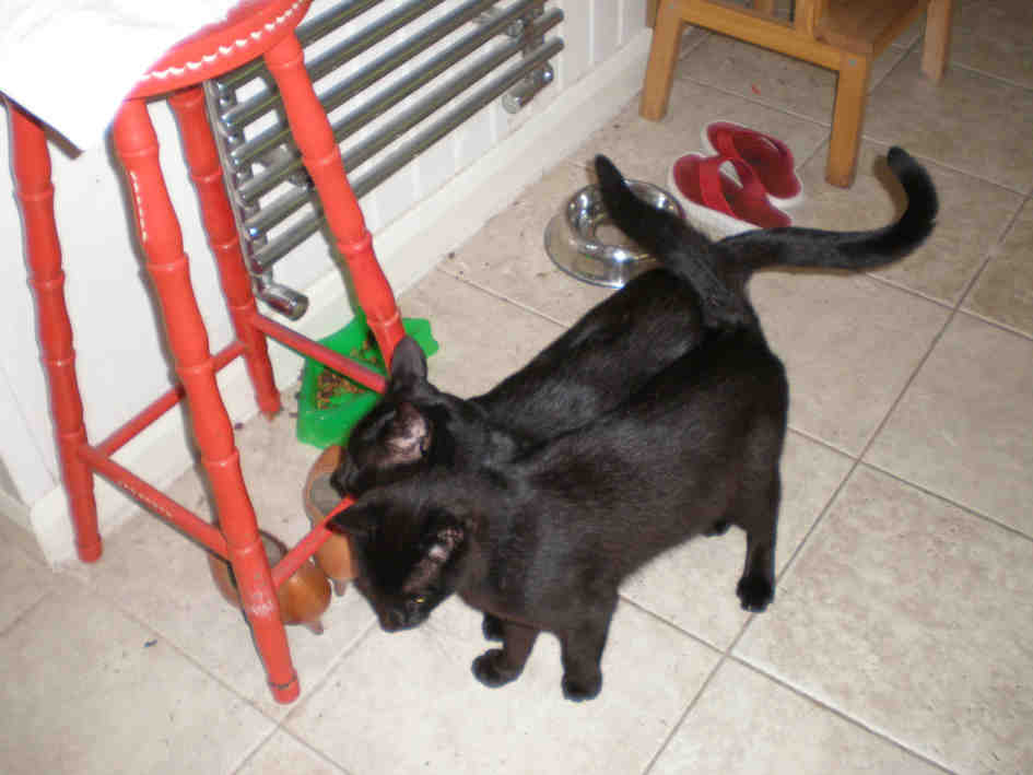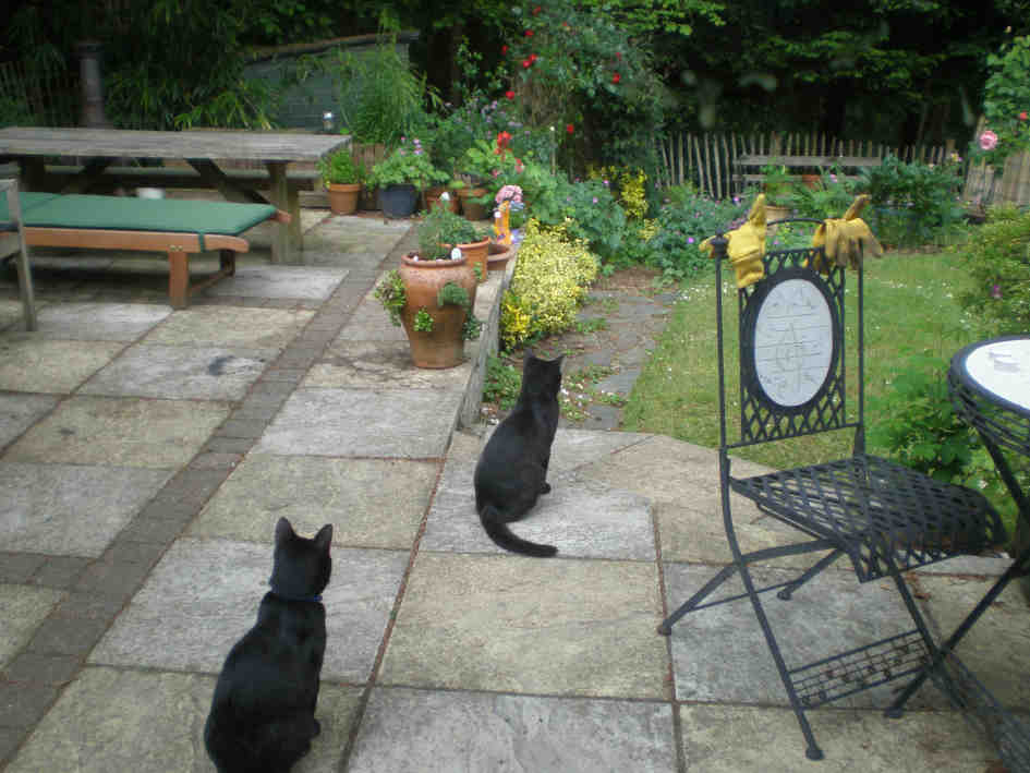 Our two rescue cats, Smartie and Mars, are making themselves at home and entertaining the neighbours as they go around together.
