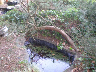 15th February 2016We had some strong winds last week, and although the tall pines at the bottom or our garden were swaying they seemed safe enough. Then next morning I looked into the back garden and saw a bit of branch lying on the garden. A bit of branch? When I went down to get a better look at it, it was a bit bigger than I thought, but luckily had missed hitting anything of importance. Here it is (right) where it ended up, perched on the edge of the pond. A few deft saw strokes later and it was firewood! |
